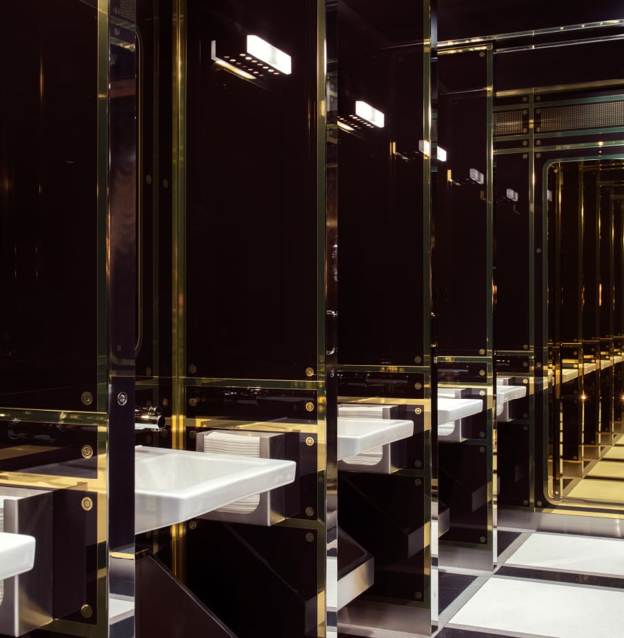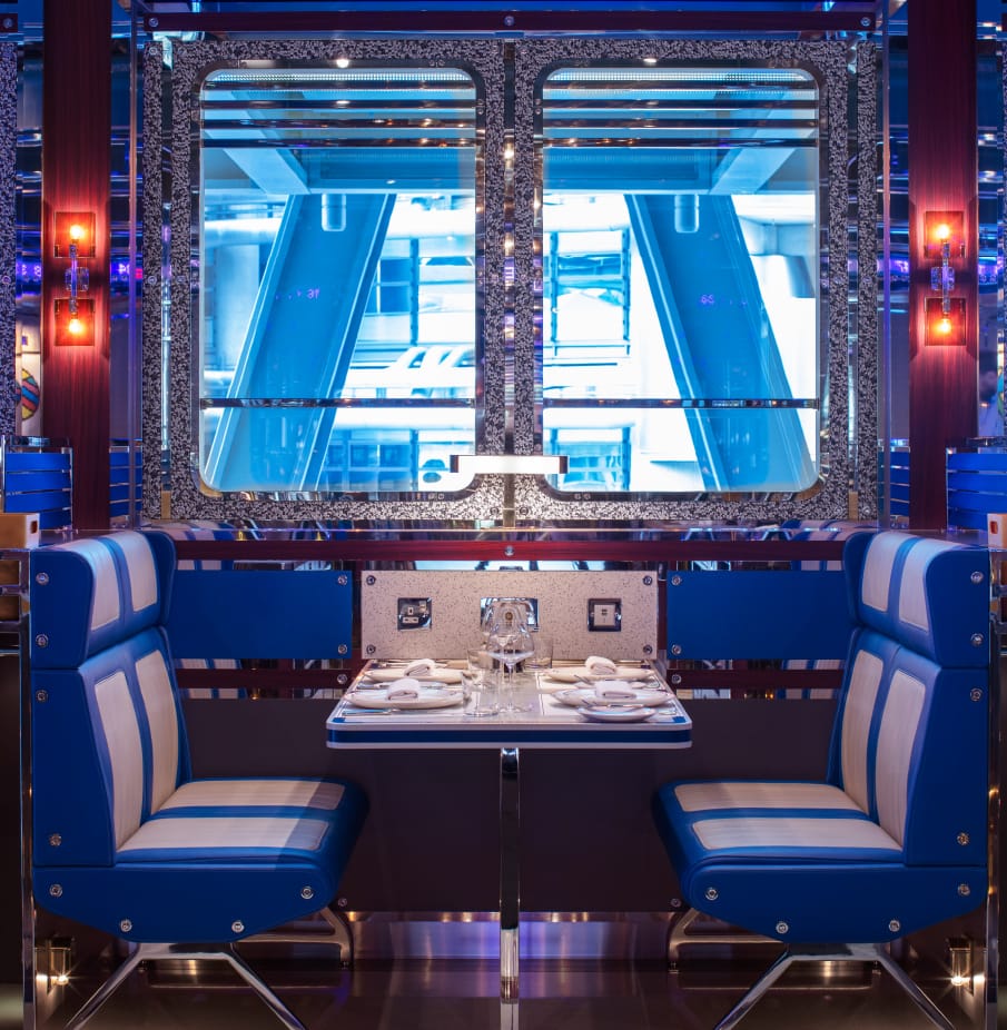 STUDIO Shayne Brady’s response was a maximalist vision rooted in discipline. Inspired by aviation and futurism, the design reimagines the idea of luxury – layering mirrored steel with plush suede, bold reds with moody blues, and sharp geometry with theatrical detail. Every plane and panel is deliberate and nothing is left to chance.