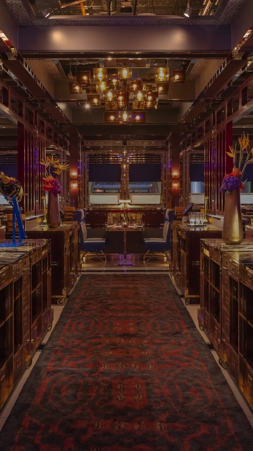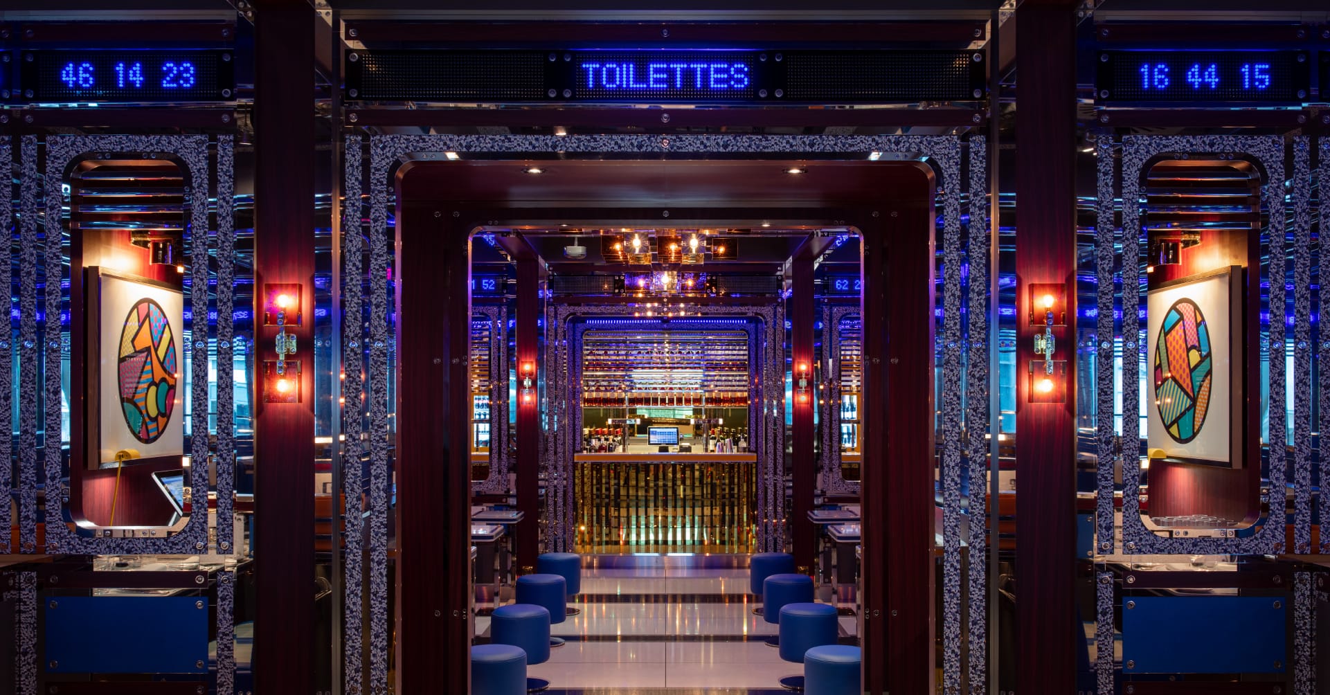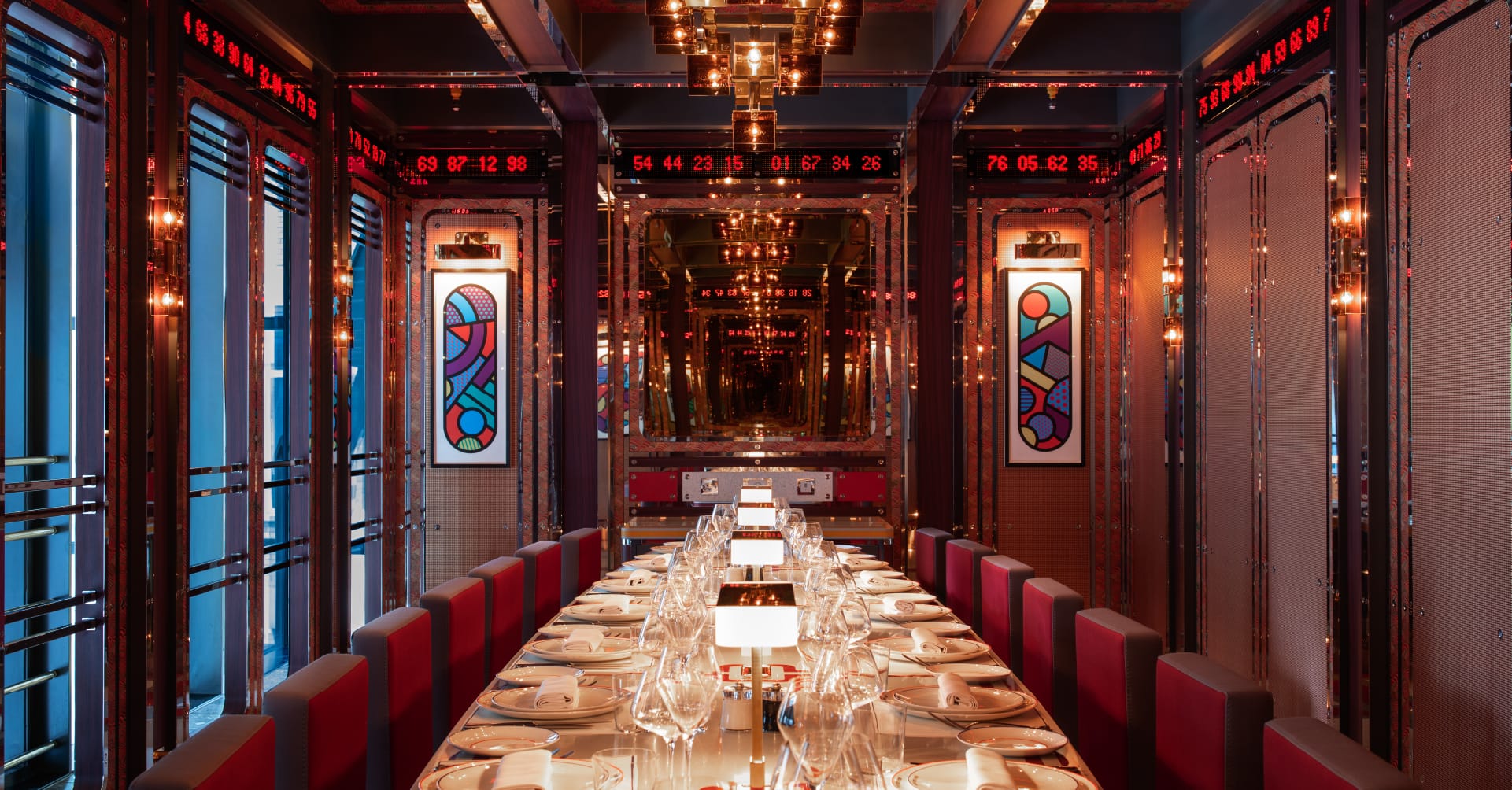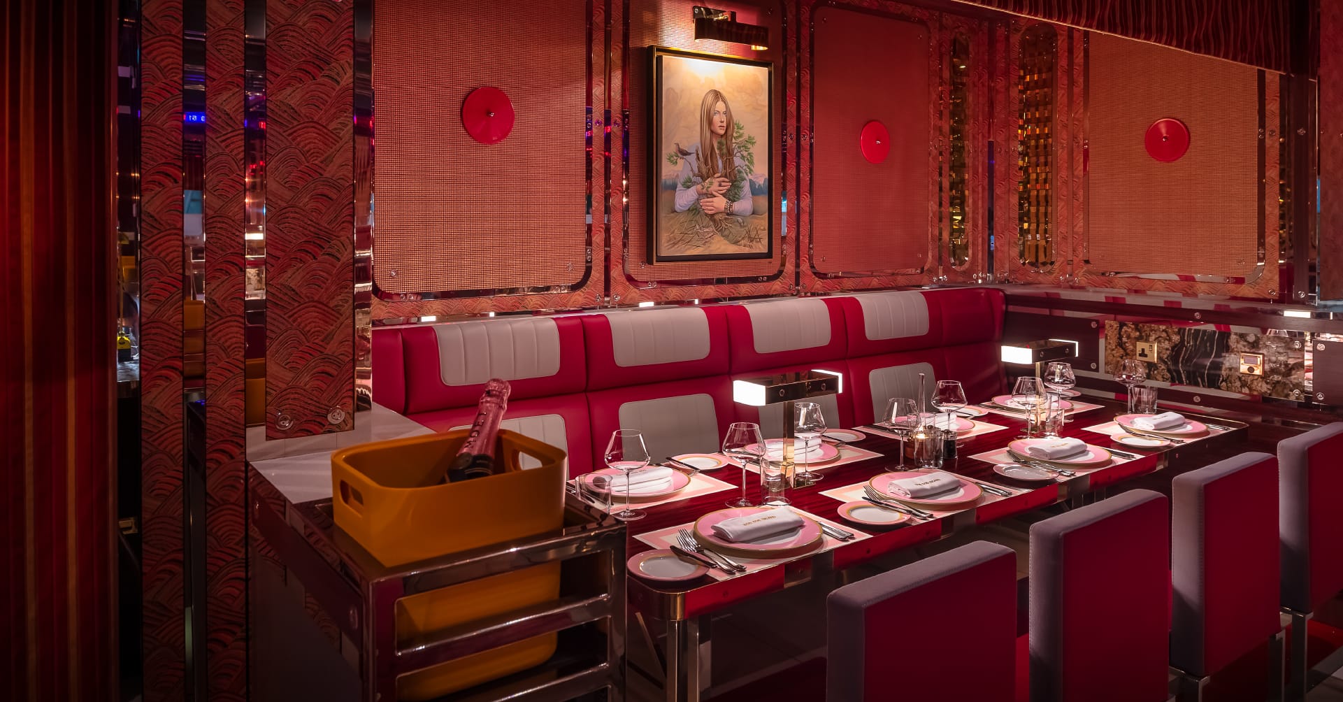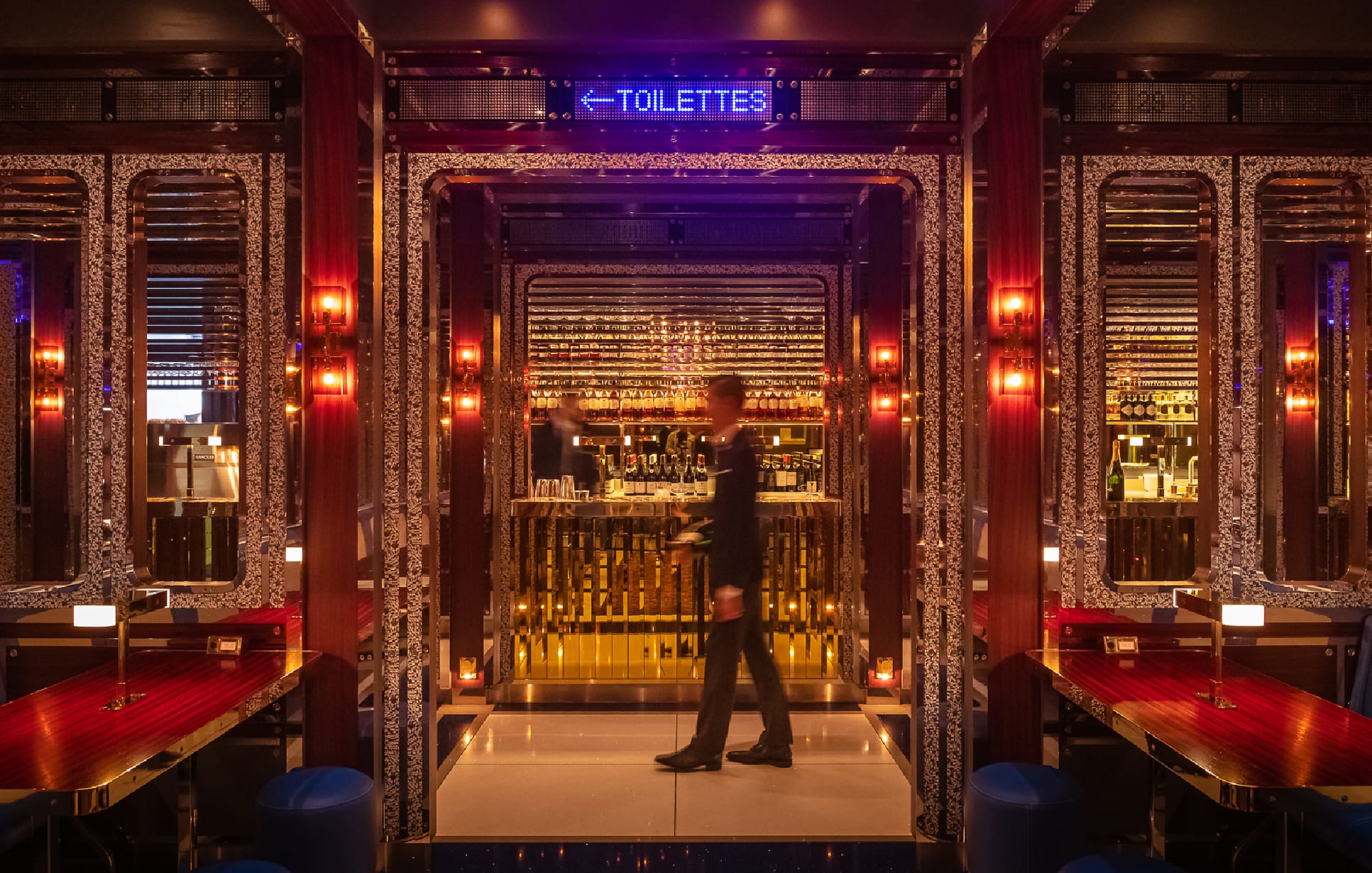 The 11,050sq ft space comprises two main dining rooms, three private dining salons with personal anterooms for receptions, and an immersive wine and champagne room where guests can browse and select their bottles. Even the 13.5-metre bar, boldly recessed with no stools, is designed for impact.