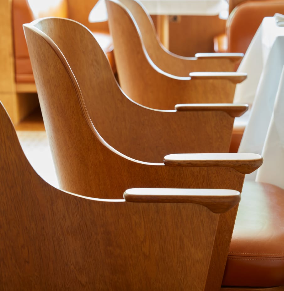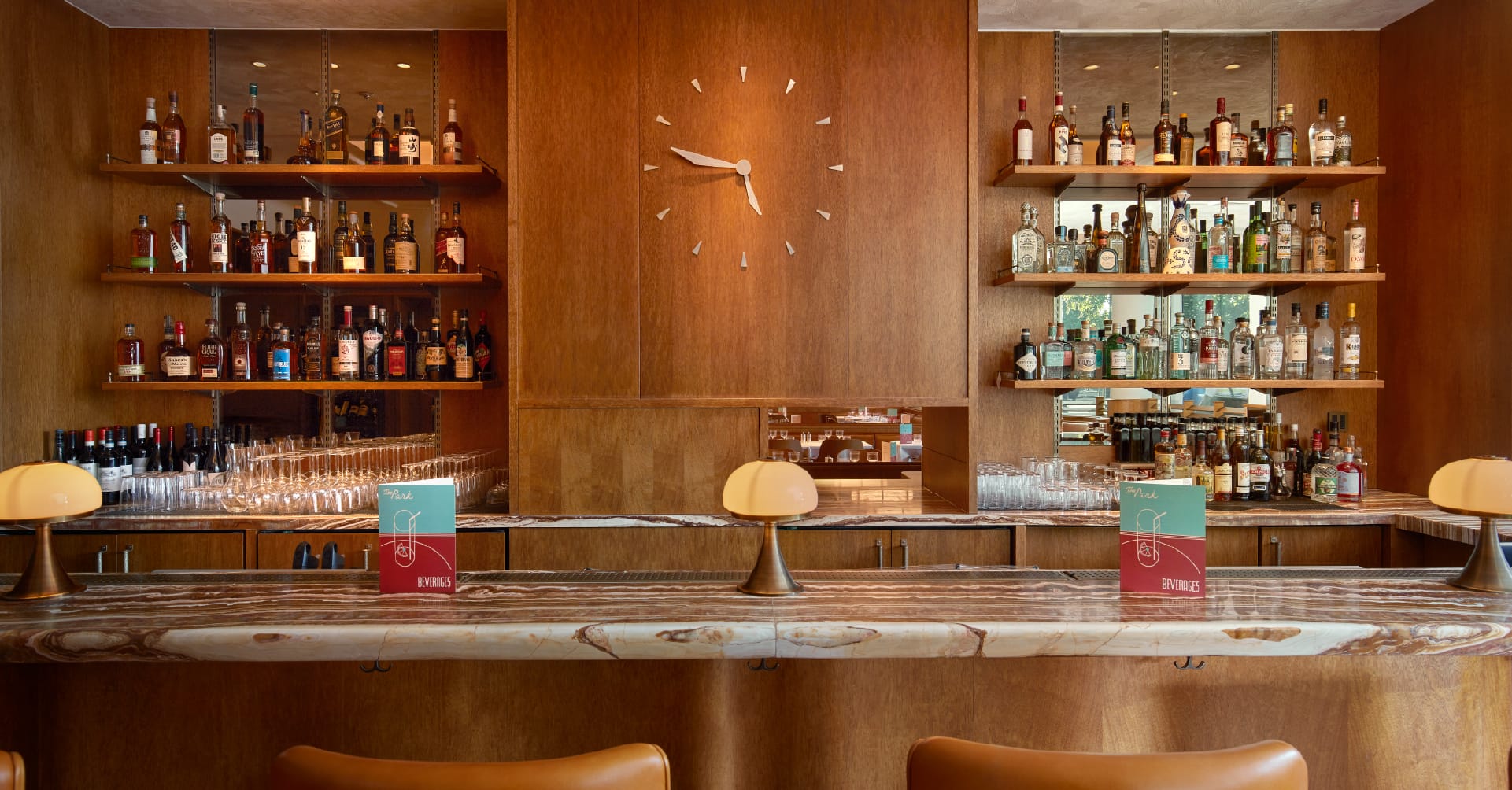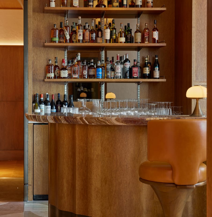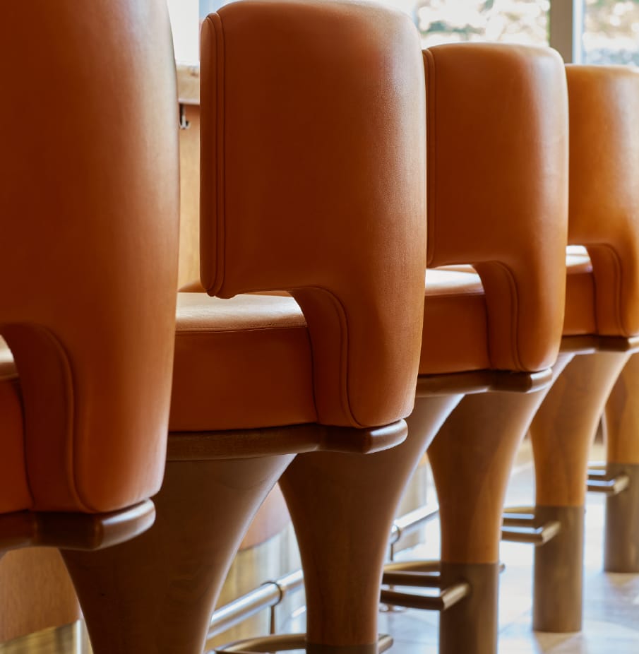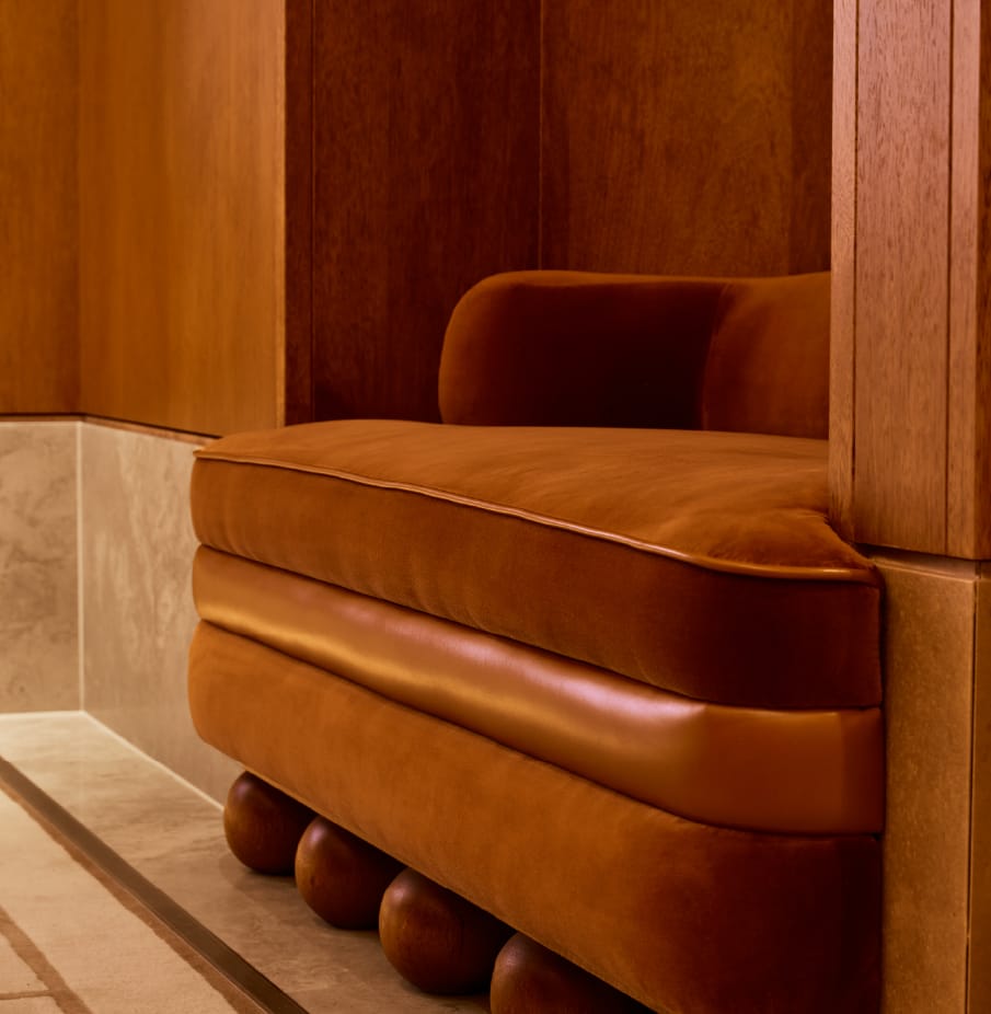 Soft caramel hues create a space that feels fresh by morning and sultry by night. The layout makes subtle theatre of every table: no seat is secondary, no corner under-considered. A custom petal parquet floor adds movement underfoot, complemented by curved limba timber panelling, alabaster pill lights and terrazzo floors in the bar. The furniture nods to mid-century America, while bespoke fixed stools and a sweeping timber bar bring a sense of ritual to the everyday.