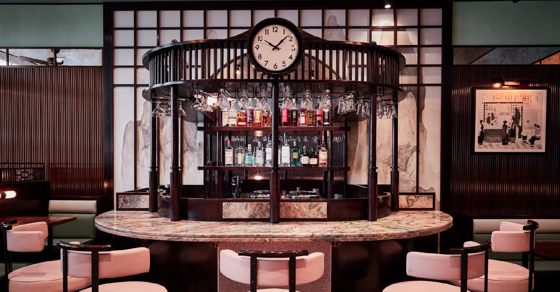 The first floor offers a more formal dining space centred around a blush marble bar and framed by a sweeping mural, Mountains of Taiwan, created bespoke for the restaurant. Throughout, the aesthetic plays with contrast: cinematic yet subtle, nostalgic yet contemporary. From the private Mahjong rooms hidden behind suede curtains to the intimate booth seating designed for lingering over rare teas, every detail is layered with narrative.